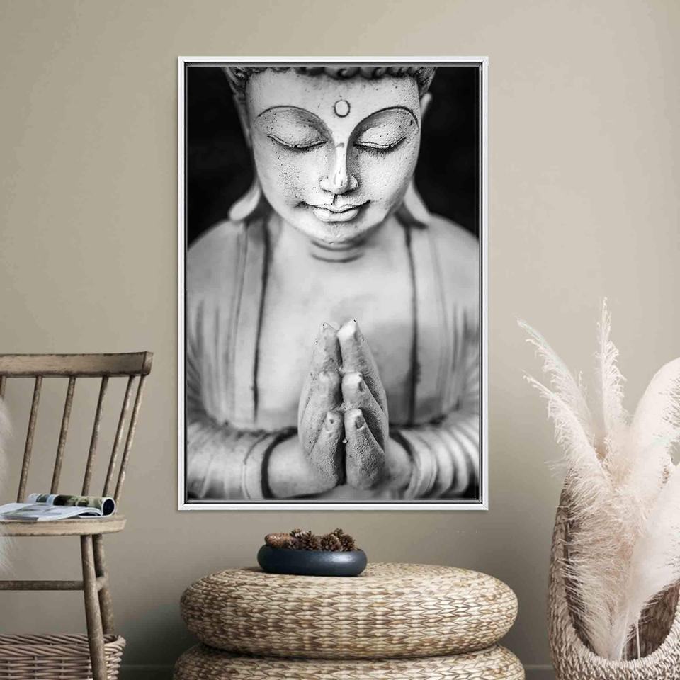 การตกแต่งแบบพุทธศาสนาสมัยใหม่: ภาพพิมพ์บนผ้าใบสำหรับตกแต่งผนัง - ความสงบสง่างาม ภาพพิมพ์บนผ้าใบพร้อมกรอบสีขาว
