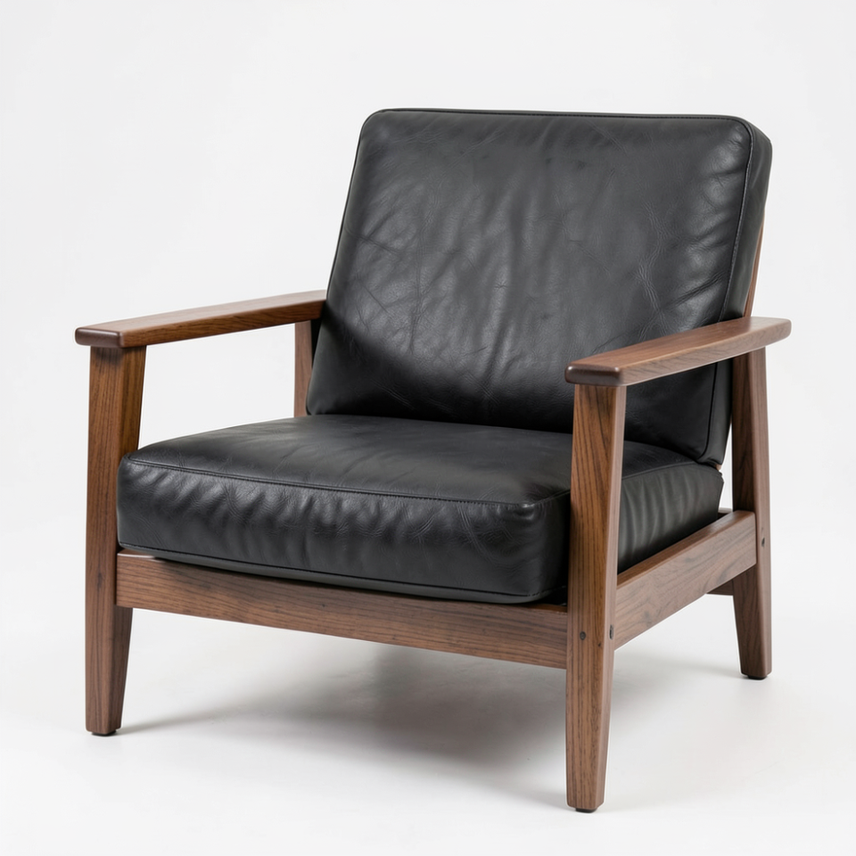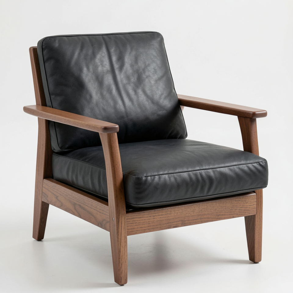 เก้าอี้คาเฟ่สไตล์โมเดิร์น สีดำ หนังวัวแท้ พร้อมโครงไม้สีน้ำตาลธรรมชาติ เฟอร์นิเจอร์สำหรับนั่งพักผ่อนในห้องนั่งเล่นที่บ้าน