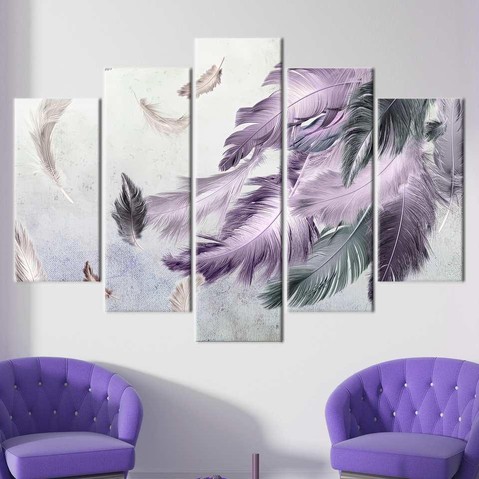 ของตกแต่งผ้าใบสไตล์โมเดิร์น: งานศิลปะลายขนนกสีม่วงและสีเทา, ชุด 5 ชิ้น: ภาพพิมพ์แบบห่อขอบ
