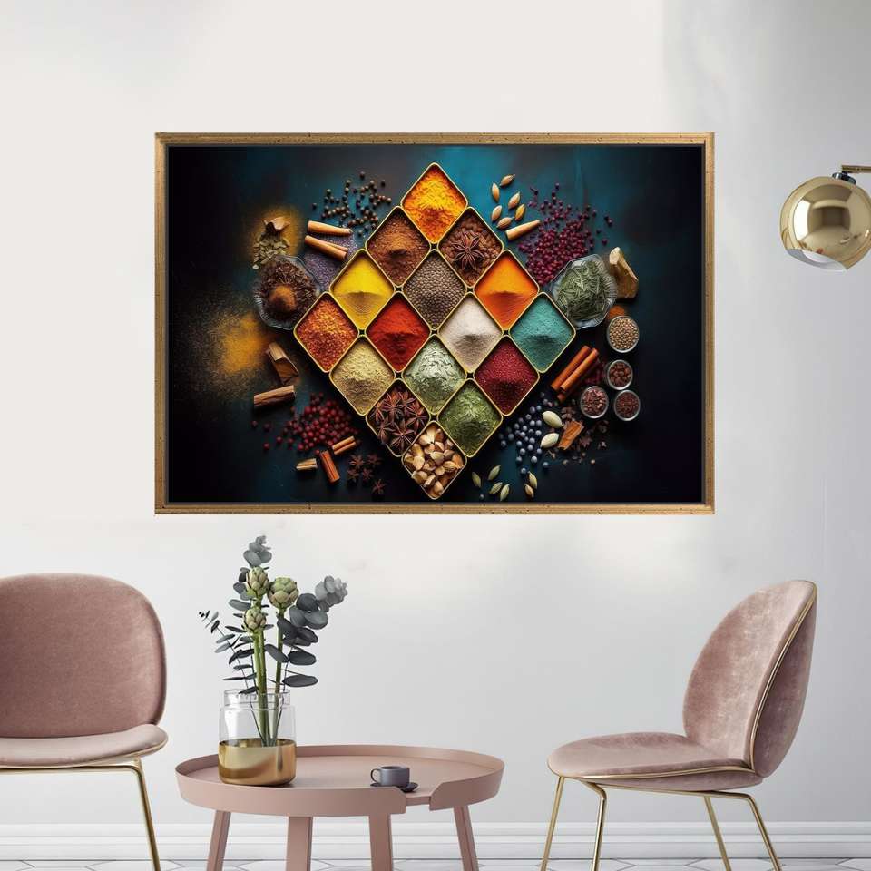 ภาพพิมพ์บนผ้าใบสมัยใหม่: งานศิลปะตกแต่งห้องครัวลายเครื่องเทศหลากสีสัน,1P:กรอบสีทอง