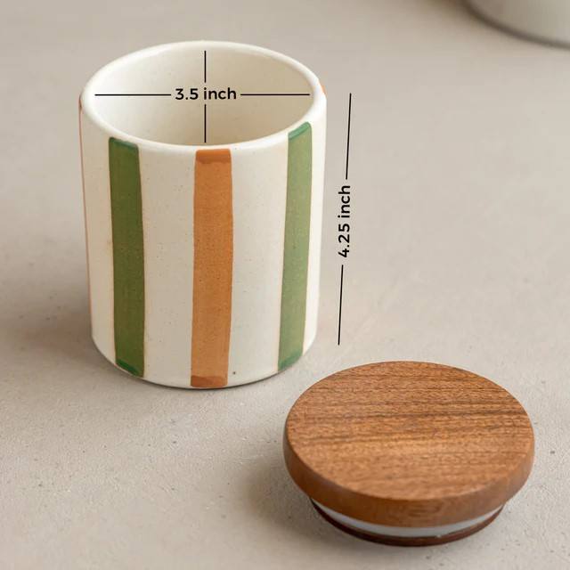 โถเซรามิกทันสมัยพร้อมฝาไม้ ปิดสนิทสำหรับเก็บอาหารในครัว ดีไซน์ลายทาง ทนทาน ใช้จัดระเบียบ ประหยัดพื้นที่ สวยงาม