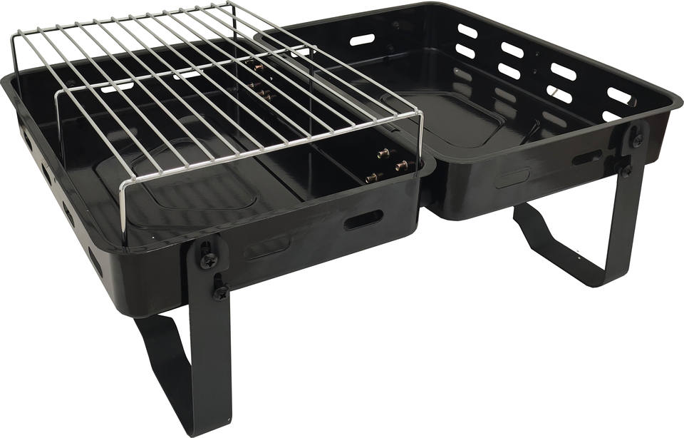 เตาปิ้งย่างพับได้แบบถ่านย่างสมัยใหม่ พร้อมอุปกรณ์ควบคุมเปลวไฟ ผลิตจากเหล็กและสแตนเลสเคลือบสีฝุ่น สำหรับ 2-3 คน ใช้กลางแจ้ง