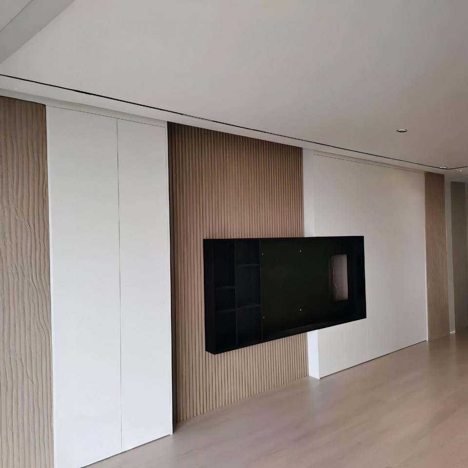 แผงตู้วางทีวีพีวีซีแบบคลาสสิกเฟอร์นิเจอร์ห้องนั่งเล่นทำจากไม้สำหรับโรงแรม