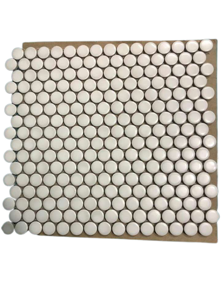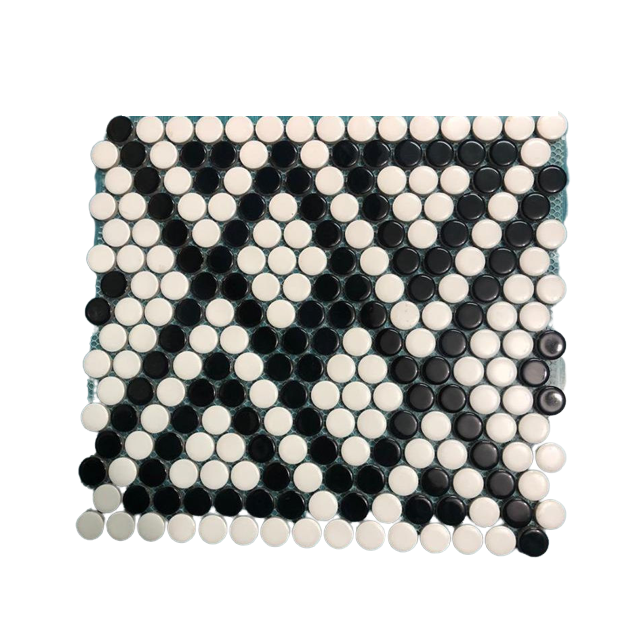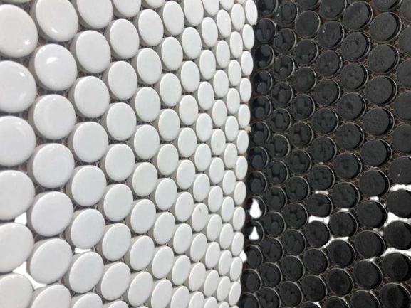 กระเบื้องโมเสคเคลือบด้านพอร์ซเลนทรงกลมสีดำมันวาวดีไซน์คลาสสิกทันสมัยฟังก์ชันไฟร์บริคสำหรับผนังภายในวิลล่าโรงแรม