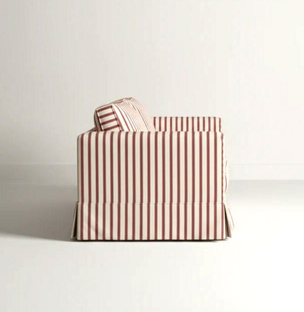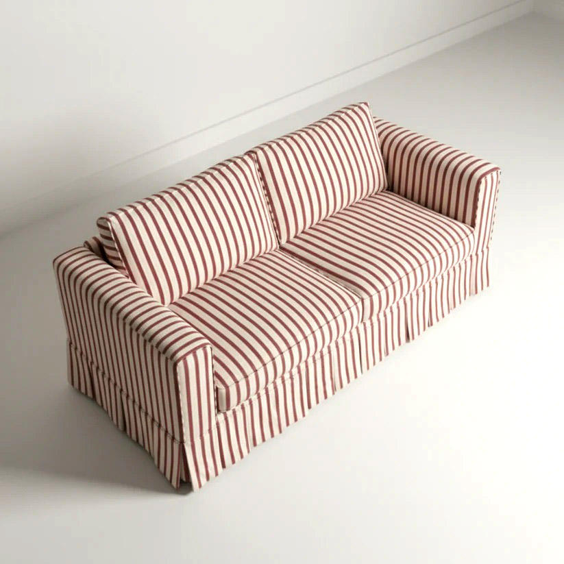 โซฟาผ้าลายทางสไตล์ฝรั่งเศสคลาสสิกสมัยใหม่ 3 ที่นั่ง พร้อมผ้าคลุมแบบมีกระโปรง โครงไม้ ลายทางสีแดงขาว แบบลายทิกกิ้ง เหมาะสำหรับโรงเรียน