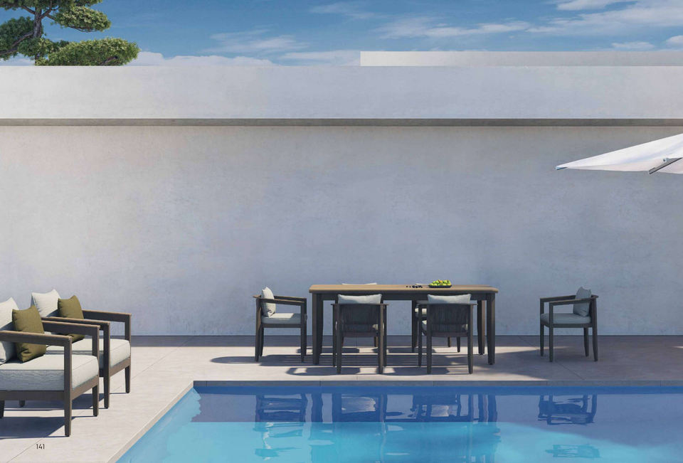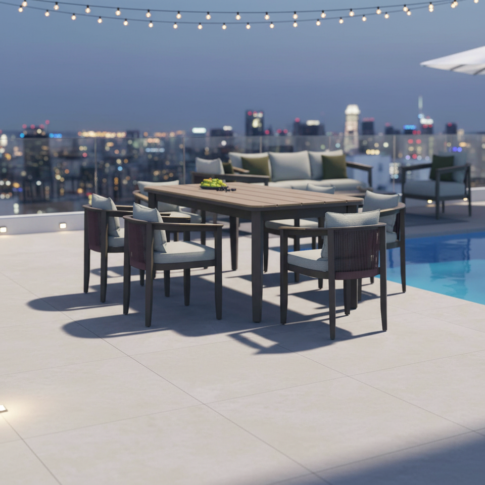 ชุดโต๊ะรับประทานอาหารกลางแจ้งอลูมิเนียมดีไซน์คลาสสิกร่วมสมัย 7 ชิ้น พร้อมเก้าอี้กันน้ำ