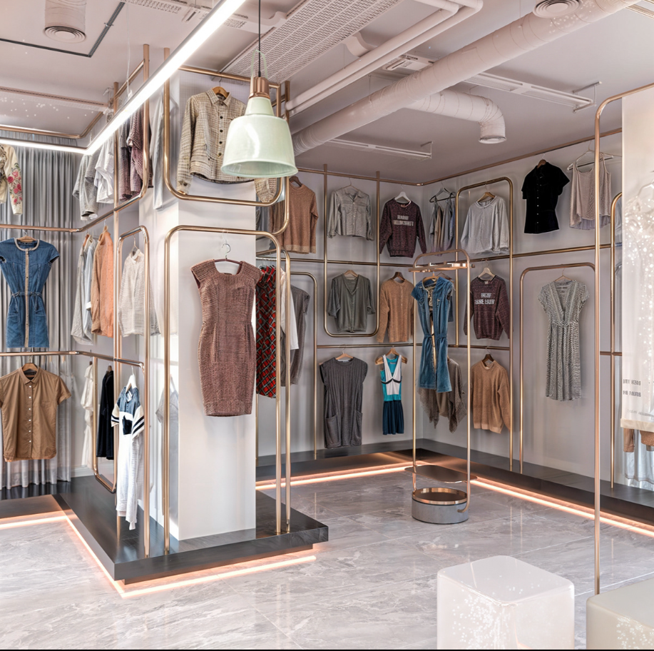 ชั้นวางโชว์เสื้อผ้าทำจากสเตนเลสสตีลดีไซน์แบบเคลือบพื้นเคาน์เตอร์ร้านค้าเสื้อผ้าที่ทันสมัย