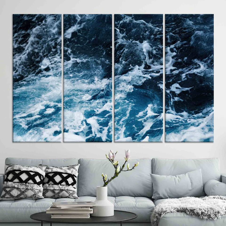 ของตกแต่งผนังสไตล์โมเดิร์นริมชายฝั่ง: ภาพพิมพ์ลายคลื่นทะเล 3 มิติบนผ้าแคนวาส ชุด 4 ผืน
