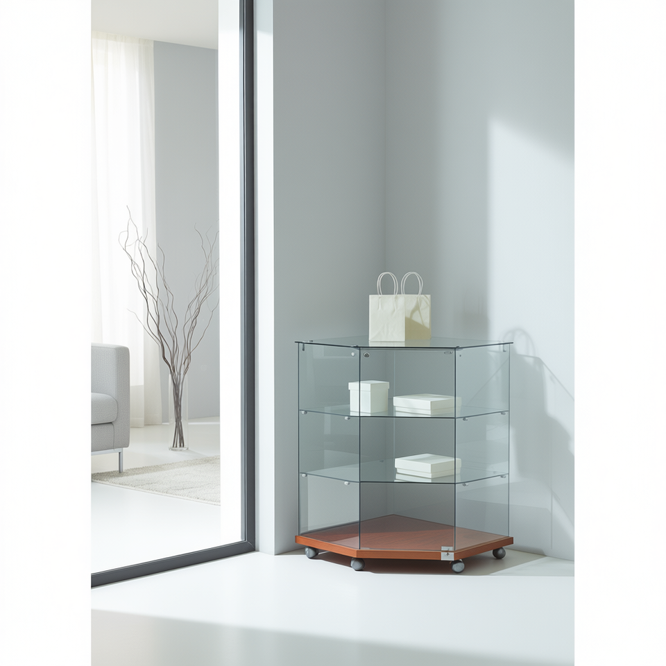 ตู้โชว์เข้ามุมทันสมัย 68x68x90 ซม. ชั้นวางกระจกนิรภัยพร้อมล้อเลื่อน ฐานไม้เชอร์รี่ สำหรับจัดเก็บในห้องนั่งเล่น