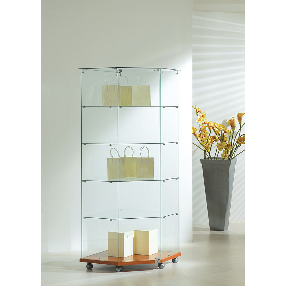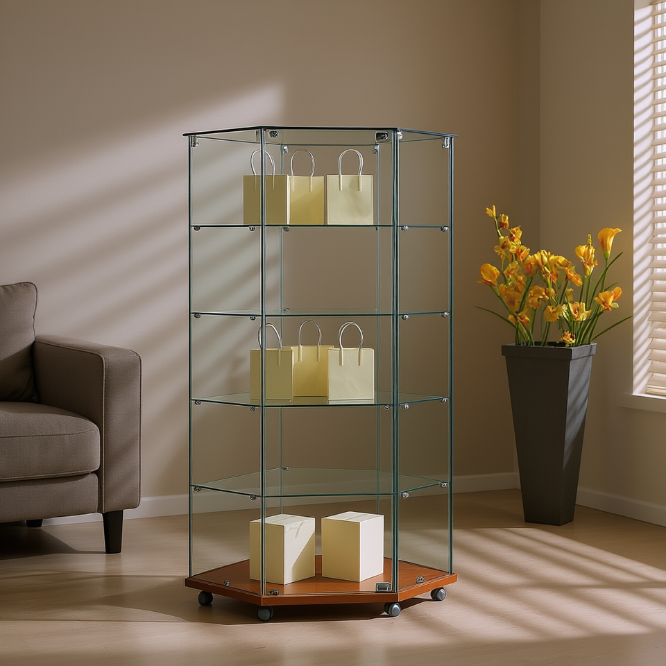 Modern Corner Showcase Tempered Glass 68x68x180cm 4 Shelves Lockable Door Castor Base Living Room Cabinet