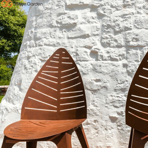 เก้าอี้เหล็กคอร์เทนทันสมัย ดีไซน์ลายใบไม้โปร่ง ทนทานต่อการเกิดสนิม เหมาะสำหรับพื้นที่นั่งเล่นกลางแจ้ง สวน ลานบ้าน โรงงาน พื้นที่สาธารณะ