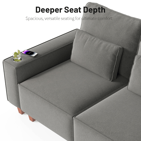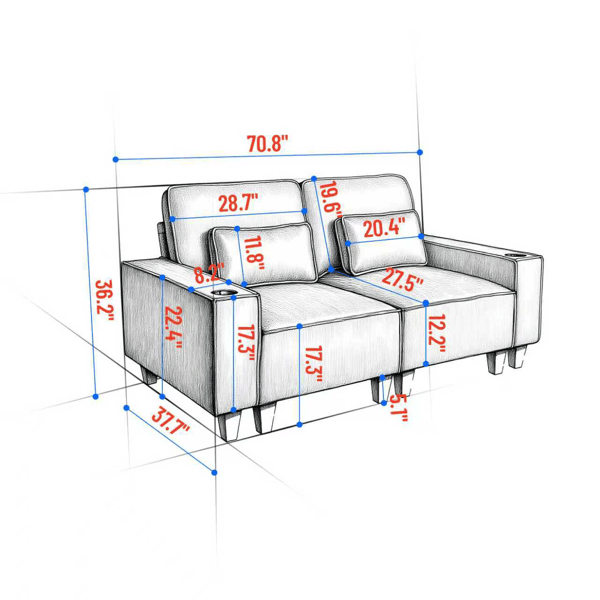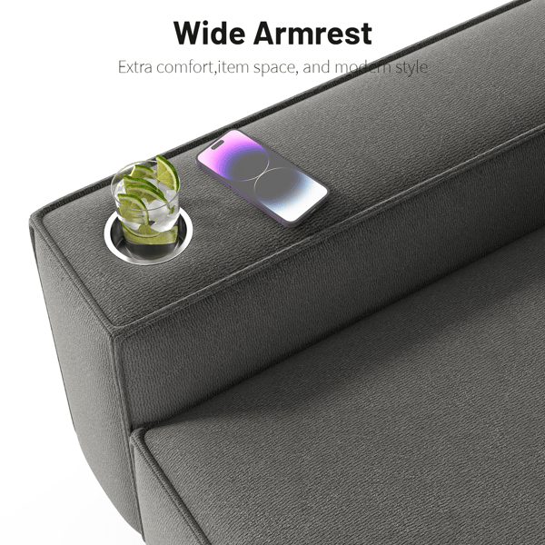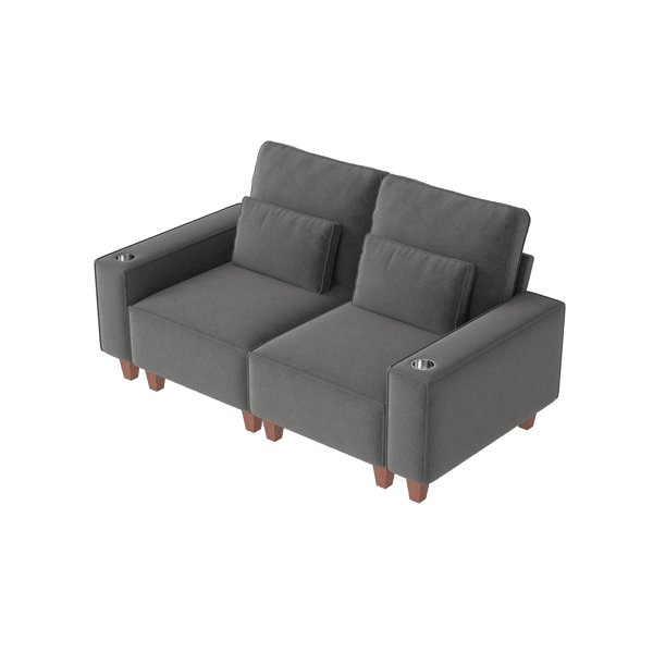 โซฟาคู่ขนาดใหญ่ 2 ที่นั่ง ดีไซน์ทันสมัย หุ้มผ้าเชนิลล์ พร้อมที่วางแก้วสแตนเลสขัดเงา และหมอนตกแต่ง 2 ใบ สำหรับห้องนั่งเล่น