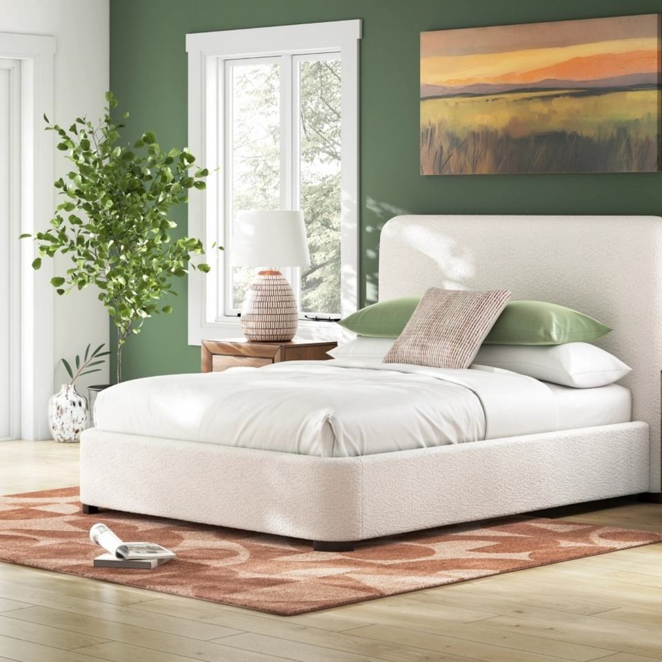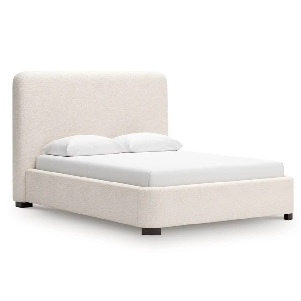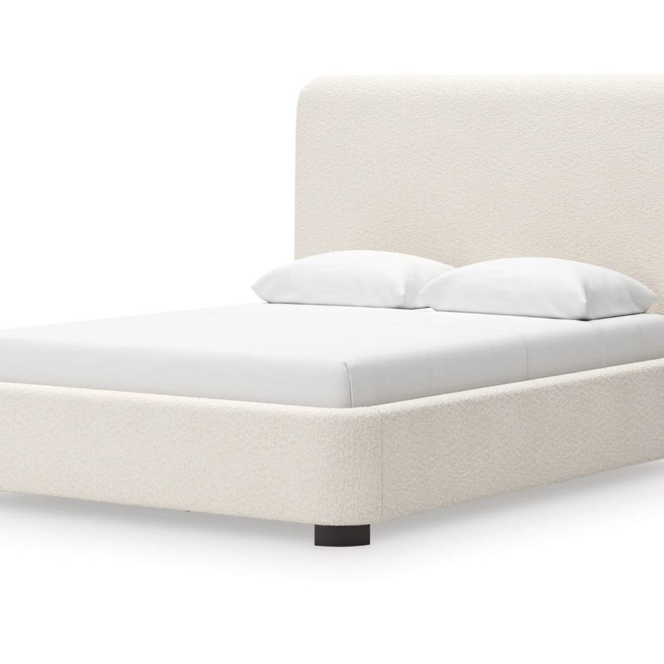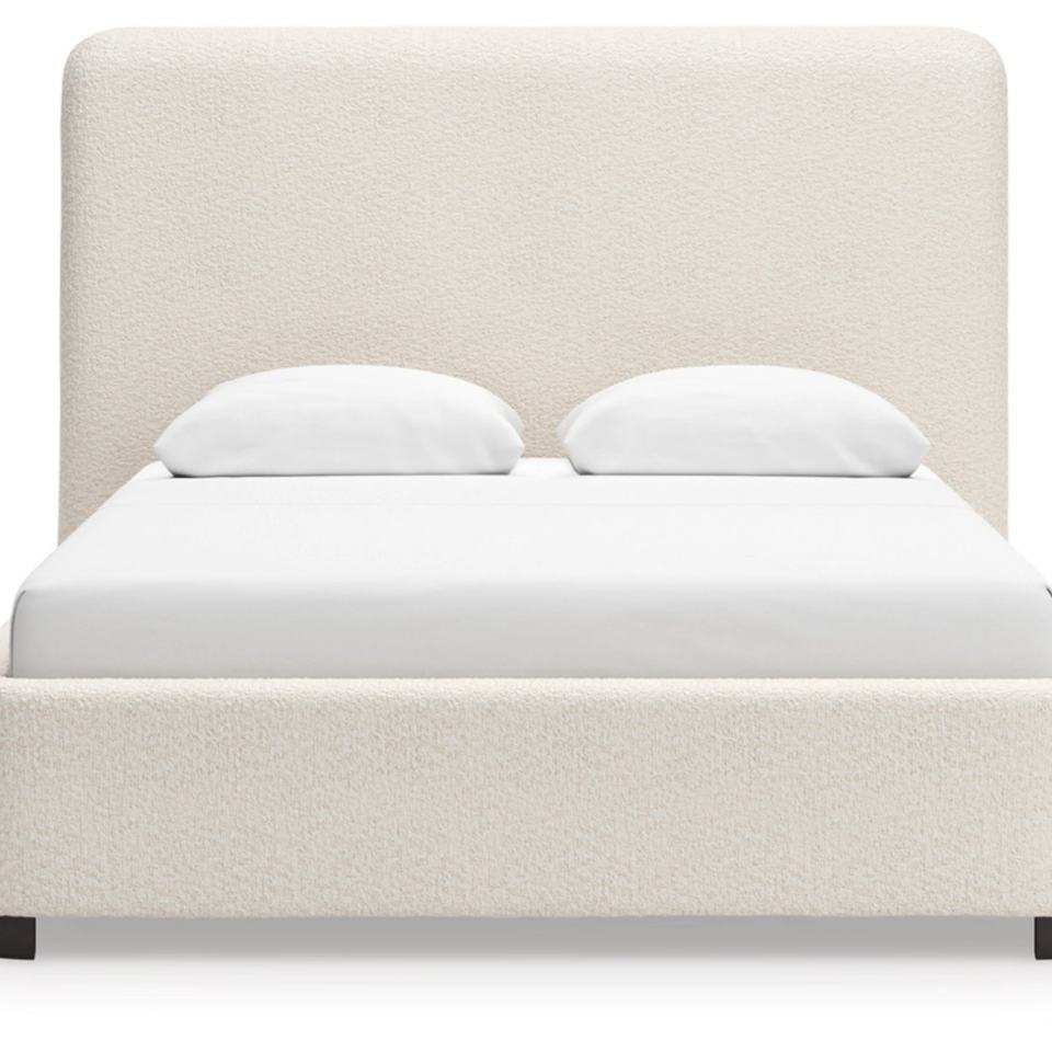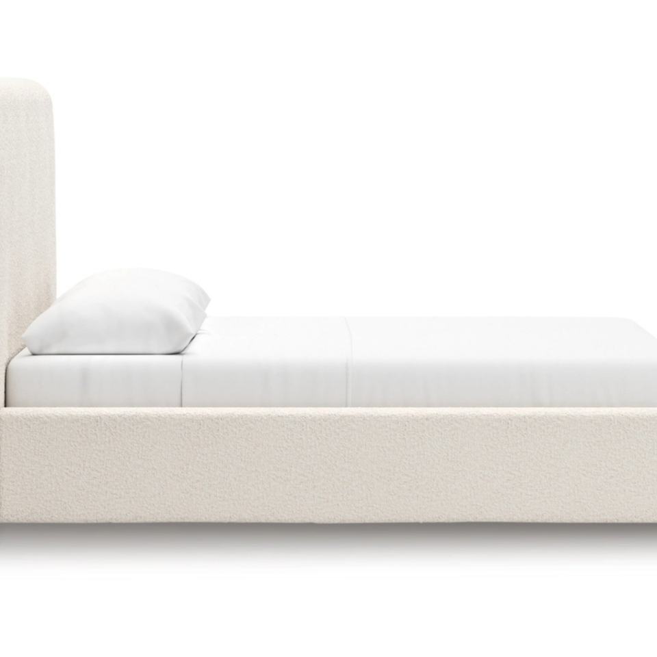 โครงเตียงไม้สีครีมสไตล์โมเดิร์น พร้อมหัวเตียงผ้าสูง ตกแต่งด้วยแผงไม้แกะสลักอย่างประณีต หุ้มเบาะอย่างหรูหราสำหรับห้องนอน