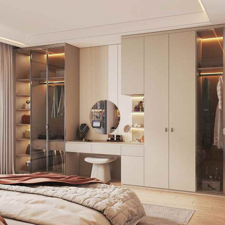 โต๊ะเครื่องแป้งไม้แบบโมเดิร์นพร้อมตู้เสื้อผ้าในตัวและโต๊ะเครื่องแป้ง ขายส่งจากโรงงานสำหรับเฟอร์นิเจอร์ห้องนอน