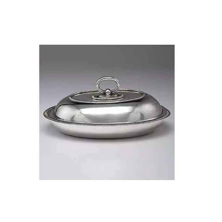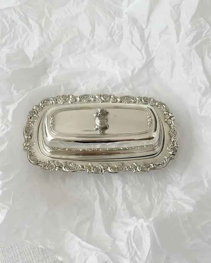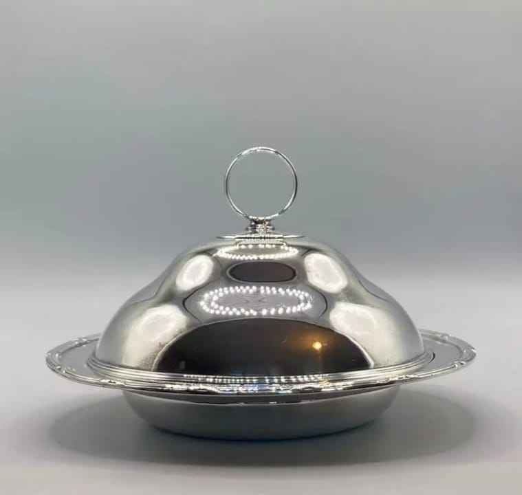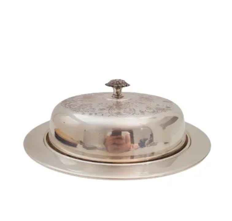 กล่องใส่เนยทรงกระบอกโลหะสีเงินทันสมัยพร้อมฝาปิดมีหูจับ กล่องเก็บเนยสแตนเลสแบบมินิมอลสำหรับวางบนเคาน์เตอร์ครัว