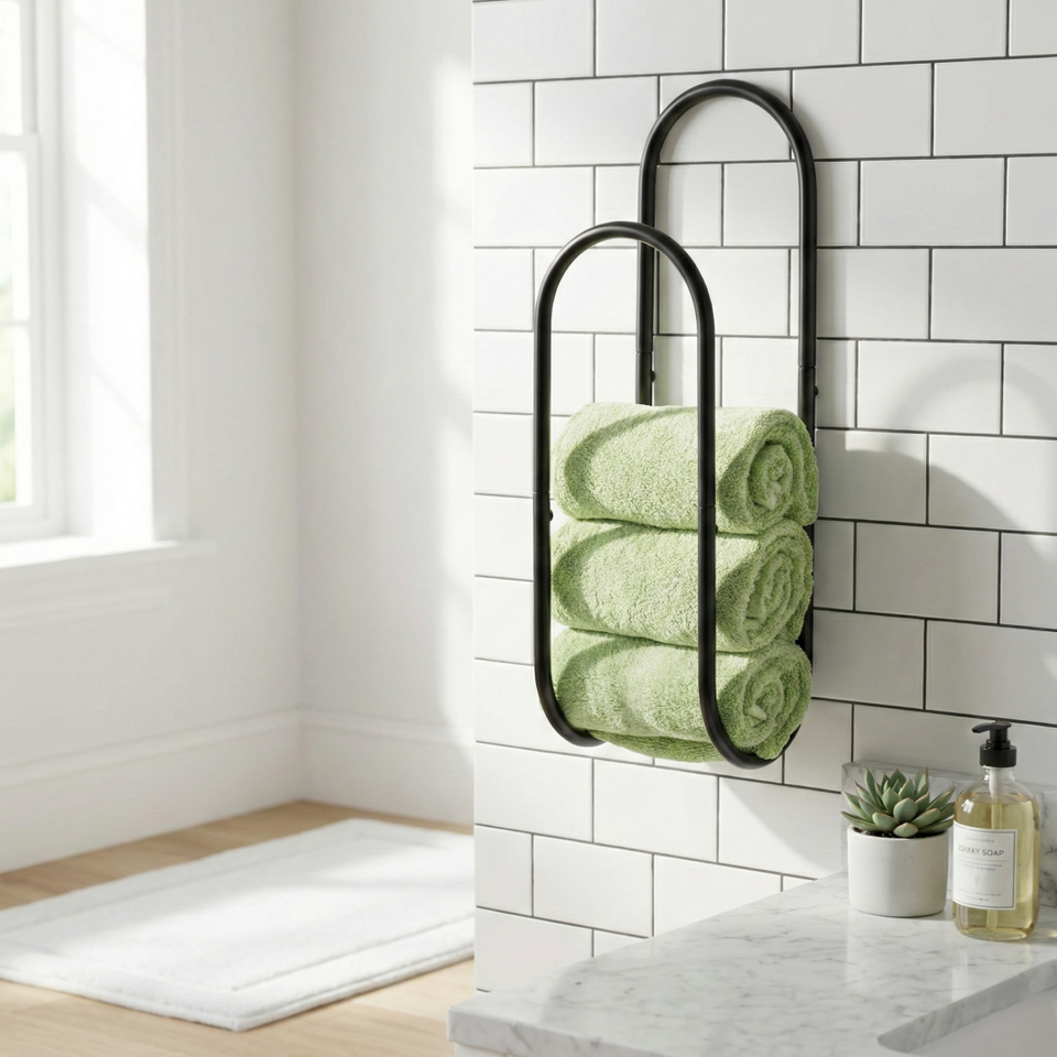 ชั้นวางผ้าขนหนูติดผนังเหล็กดัดทรงโค้ง รุ่น BR256 สไตล์ไม้ MDF สำหรับห้องน้ำและห้องนั่งเล่น เฟอร์นิเจอร์ตกแต่งบ้านแบบ DIY ทันสมัย