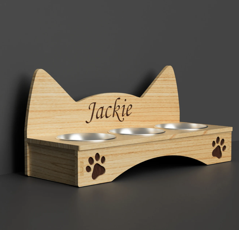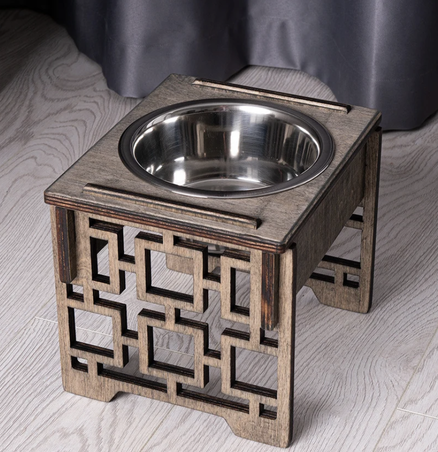 ชามอาหารสัตว์เลี้ยงแบบยกสูงทำจากไม้ตกแต่งกระดูกสุนัขทันสมัย