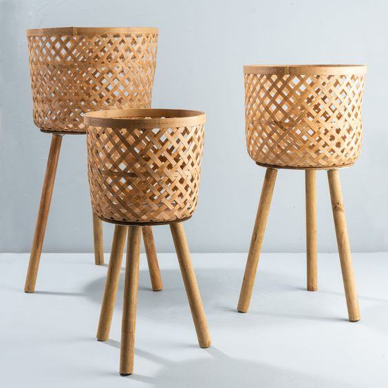 ตะกร้าหวายหวายทำจากไม้ไผ่ของตกแต่งบ้านที่แกะสลักด้วยมือเป็นมิตรต่อสิ่งแวดล้อมกระถางต้นไม้ดีไซน์ทันสมัย