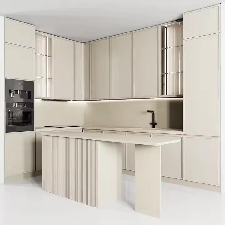 ตู้ครัวไม้จริงสั่งทำตามแบบทันสมัยสำหรับโครงการอพาร์ทเมนต์ พร้อมแผงไม้อัด ทำความสะอาดง่าย ติดตั้งสะดวก พร้อมไอส์แลนด์