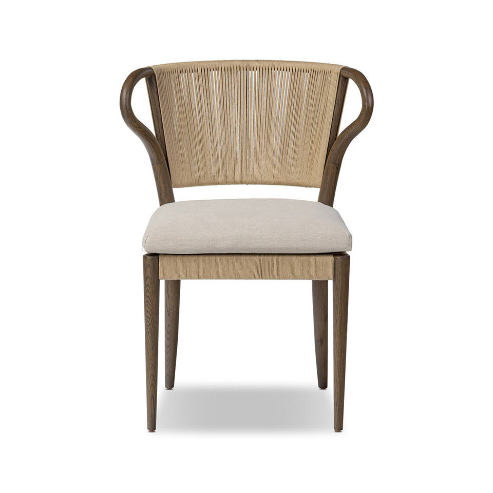 เก้าอี้รับประทานอาหารดีไซน์ทันสมัย โครงไม้สักแท้ พร้อมเบาะหุ้มผ้าและพนักพิงหวาย สำหรับใช้ภายในและภายนอกอาคาร
