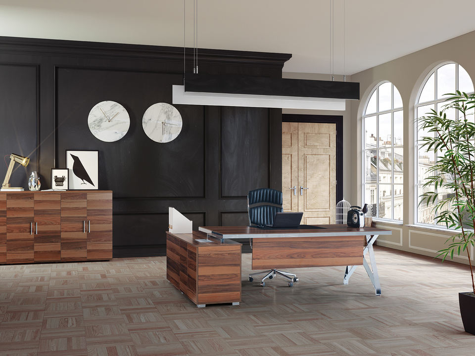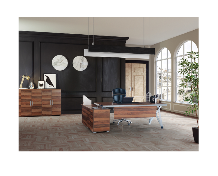 โต๊ะทำงานผู้บริหารแบบโมดูลาร์ รุ่น Modern Aura Series E1 ผลิตจากแผ่นเมลามีนเกรดพรีเมียม พร้อมการรับรองมาตรฐาน ISO และขอบ PVC