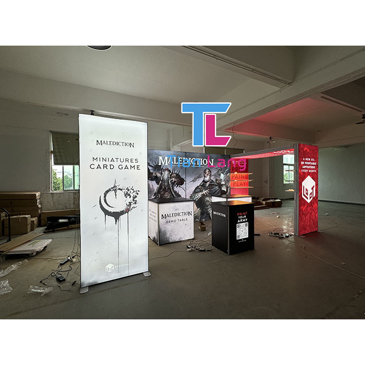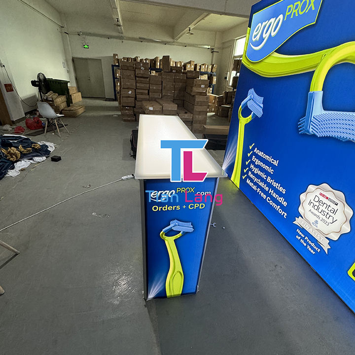 โต๊ะด้านหน้าแสดงแบบโมดูลาร์หน้าจอง่ายสำหรับจัดแสดงนิทรรศการวิดีโอมีเดียโต๊ะต้อนรับงานแสดงสินค้าโต๊ะ LED