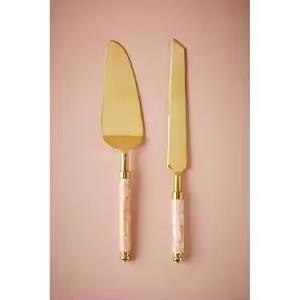 ชุดเสิร์ฟเค้กโลหะสีทองดีไซน์ทันสมัยมีด้ามจับสีฟ้าของหวานหรูหราอุปกรณ์เสิร์ฟพรีเมียมสำหรับงานแต่งงานวันเกิดและงานเลี้ยง