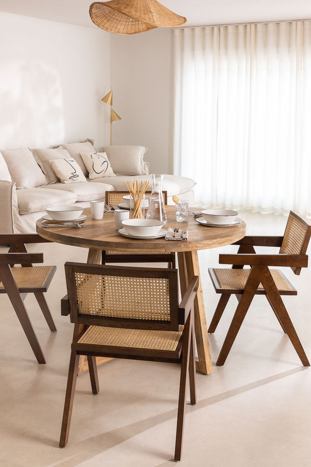 คำอธิบาย:เก้าอี้ทานอาหารหวายไม้ สำหรับใช้ภายในหรือภายนอกอาคาร ผิวสัมผัสธรรมชาติ