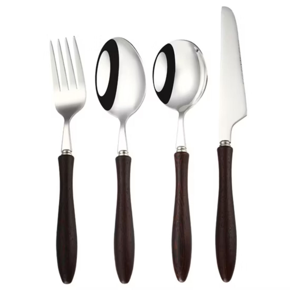 ชุดช้อนส้อมสแตนเลสดีไซน์ทันสมัยพร้อมด้ามจับไม้ธรรมชาติและเรซิ่นสีขาว สำหรับโรงแรม ราคาโรงงาน