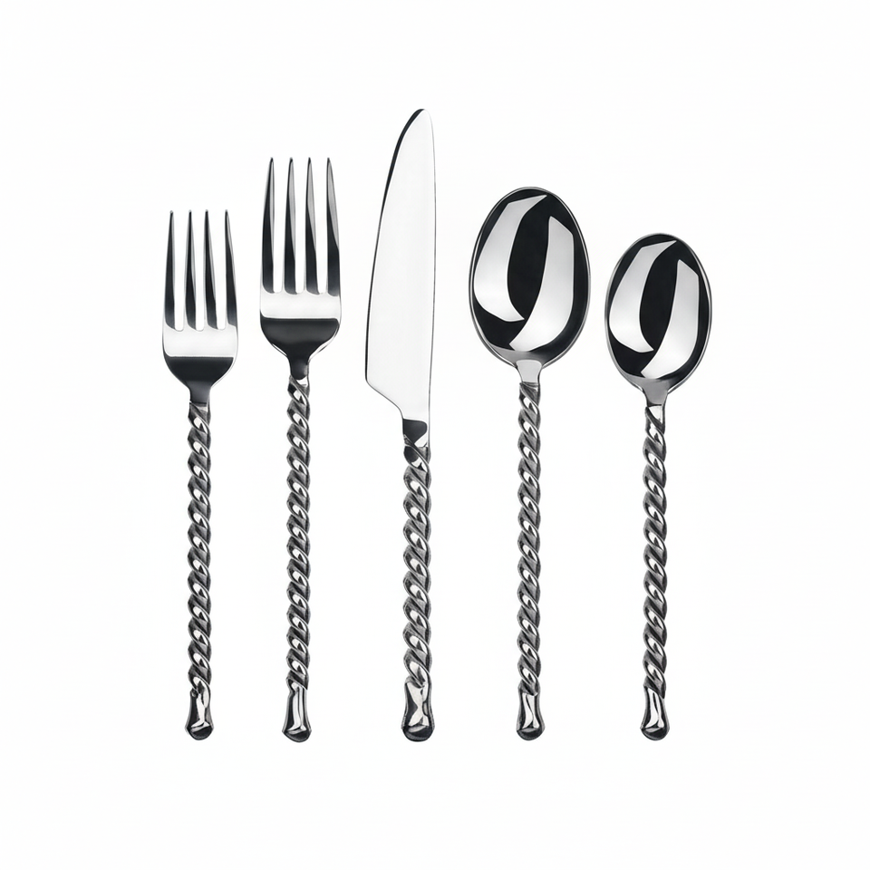 ชุดช้อนส้อมสแตนเลสโลหะแบบทุบสีเงินแบบคู่เครื่องใช้ในครัวดีไซน์ใหม่สำหรับกลับไปเรียนดีไซน์ใหม่