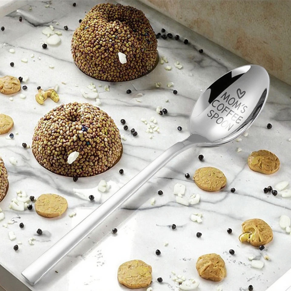 ช้อนสแตนเลสสตีลดีไซน์ทันสมัย สีเงิน สำหรับทานอาหาร สามารถสลักข้อความได้ฟรี เหมาะสำหรับเป็นของขวัญงานแต่งงาน หรือใช้ในร้านอาหาร ผิวขัดเงาแบบกระจก