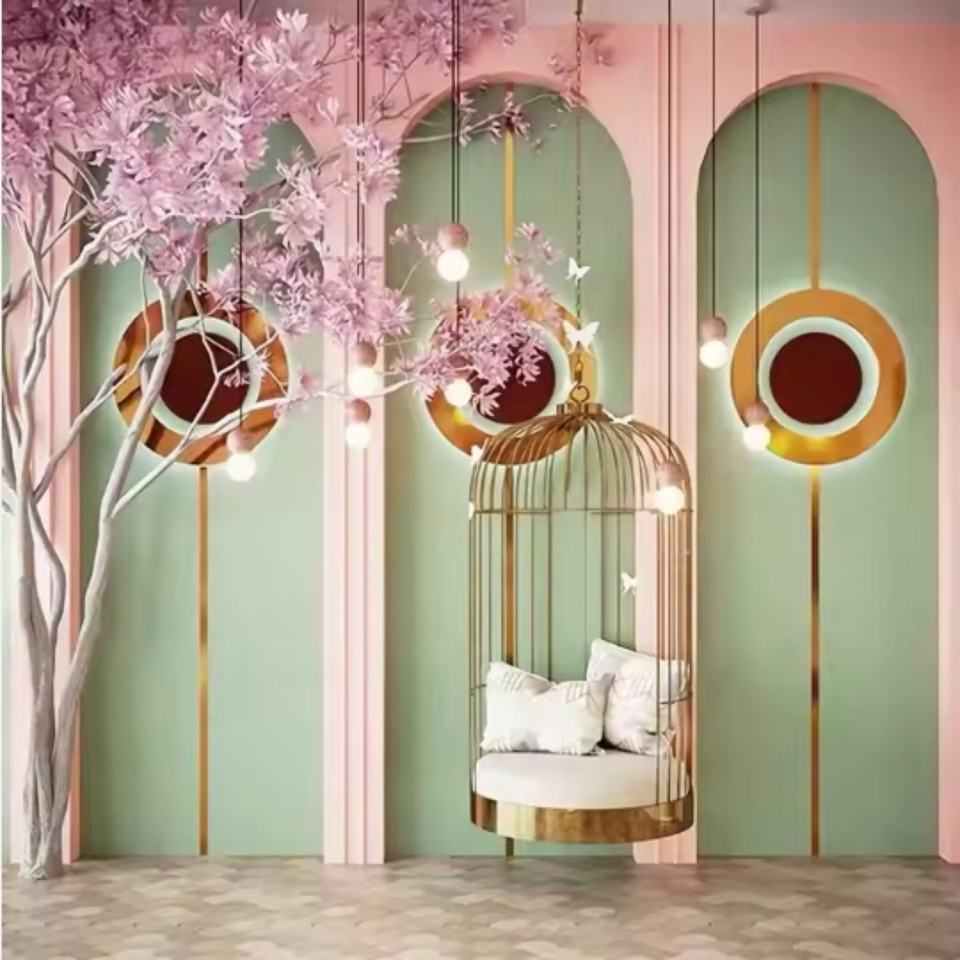 เก้าอี้สวิงดีไซน์ทันสมัย เฟอร์นิเจอร์ล็อบบี้โรงแรม เก้าอี้กรงนกเคลือบทอง เบาะนั่งแบบแขวน