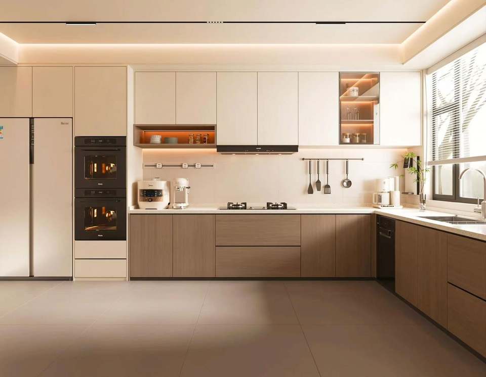 ตู้ครัวเทอร์โมฟอยล์ดีไซน์ทันสมัย พร้อมบานตู้และลิ้นชักไม้เนื้อแข็งกันความชื้น
