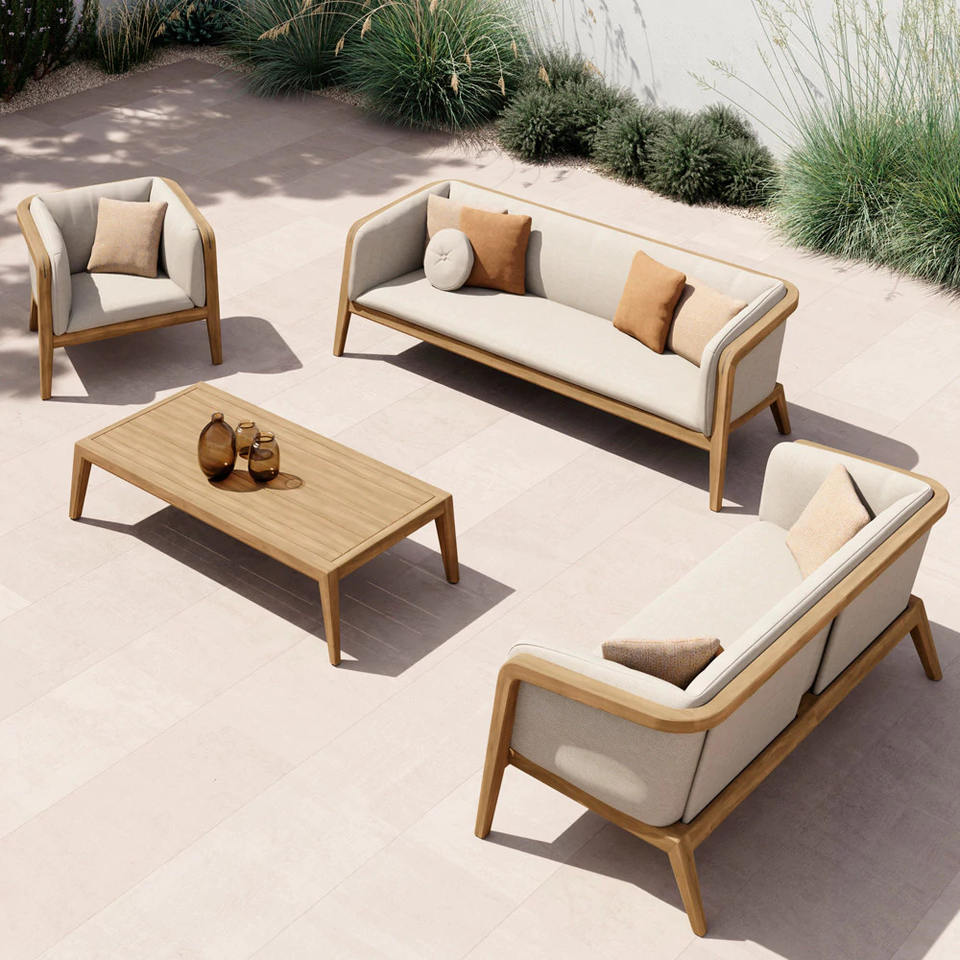 ชุดโซฟาไม้สักสำหรับสวน บุด้วยเบาะนุ่ม ผิวสัมผัสธรรมชาติ