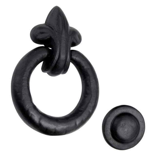 ที่เคาะประตูเหล็กหล่อสีดำโบราณของนักออกแบบสมัยใหม่แหวนบิดมือปลอมทำด้วยมือฮาร์ดแวร์ที่ทนทานใช้ง่ายในบ้าน