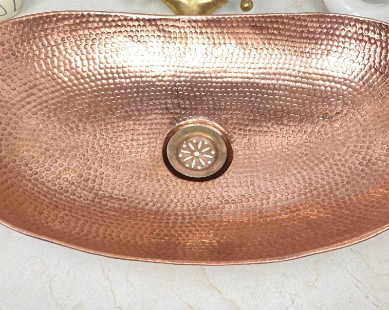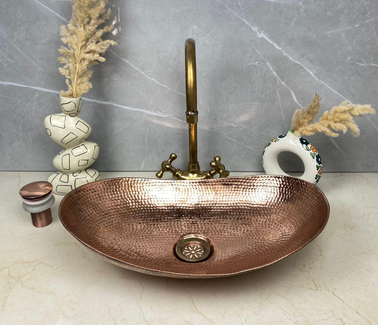 อ่างล้างจานทองแดงทรงรีดีไซน์ทันสมัย พร้อมงานตกแต่งแบบอาร์ติสัน เหมาะสำหรับพื้นที่ภายในที่มีสไตล์คลาสสิกและทันสมัย