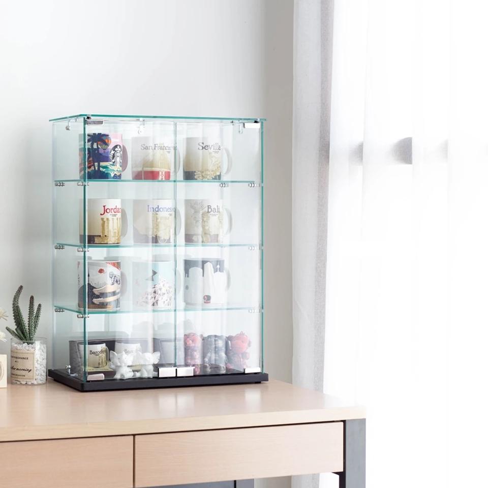 ตู้โชว์กระจกนิรภัยแบบตั้งโต๊ะทันสมัย ชั้นวางกันฝุ่นสำหรับของสะสม ห้องนั่งเล่น โรงแรม บาร์ในบ้าน ห้างสรรพสินค้า