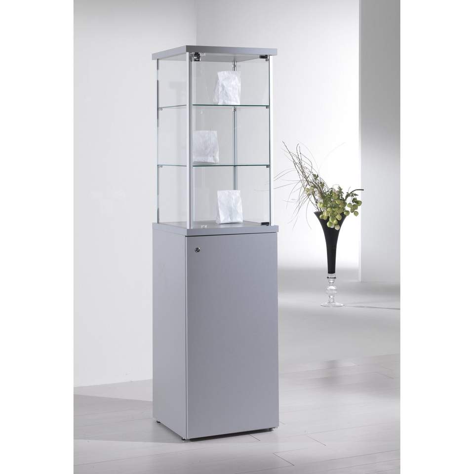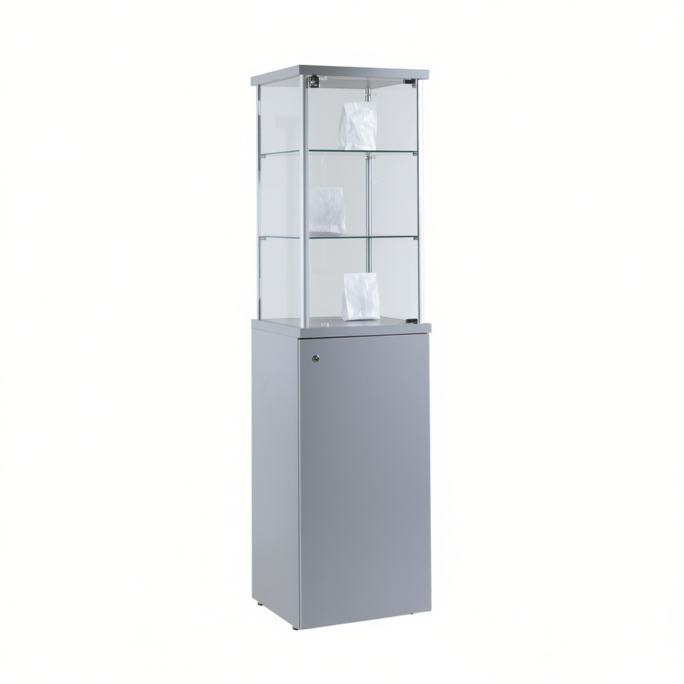 ตู้โชว์โมเดิร์น 45x45x175 ซม. กรอบอลูมิเนียมสีเทาอ่อน ชั้นวางกระจกนิรภัย ประตูล็อคได้