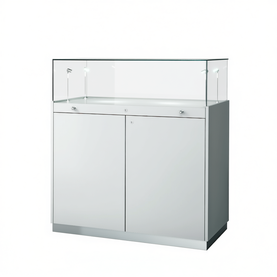 เคาน์เตอร์โชว์สินค้าทันสมัย 100x50x110 ซม. สีขาวเงา พร้อมท็อปกระจกและไฟ LED สำหรับการขายปลีก