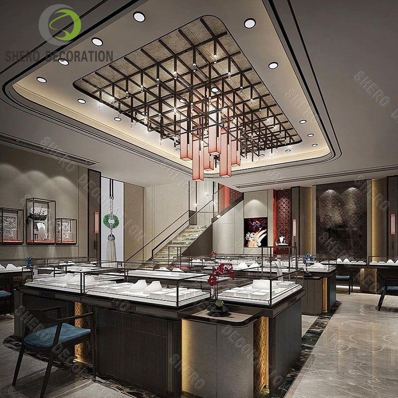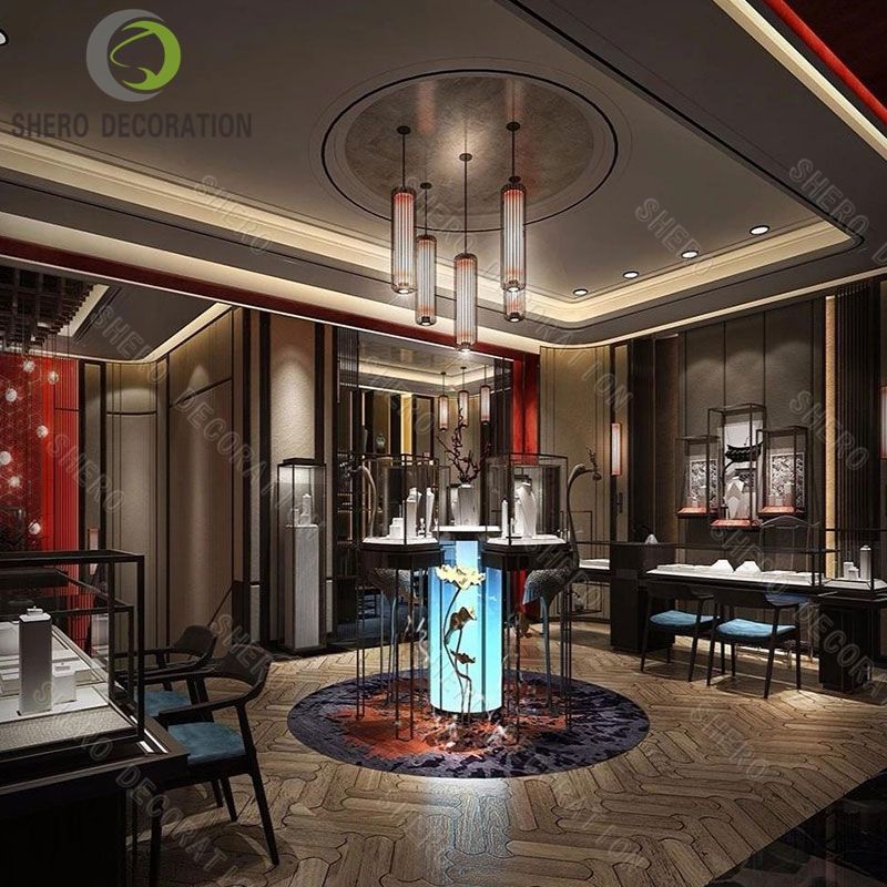 ตู้โชว์สินค้าสมัยใหม่สำหรับร้านขายเครื่องประดับในห้างสรรพสินค้า ตู้โชว์แบบมีไฟ ตู้โชว์เครื่องประดับเพชรแบบเคาน์เตอร์กลางร้าน