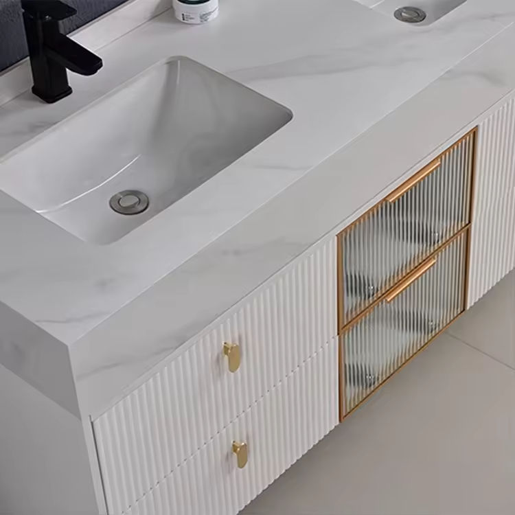 ตู้ห้องน้ำติดผนังแบบลอยตัวอ่างล้างหน้าคู่ทันสมัย พร้อมตู้กระจก LED สำหรับบ้านอัจฉริยะ กันน้ำ เหมาะสำหรับโรงแรม โรงเรียน อพาร์ตเมนต์