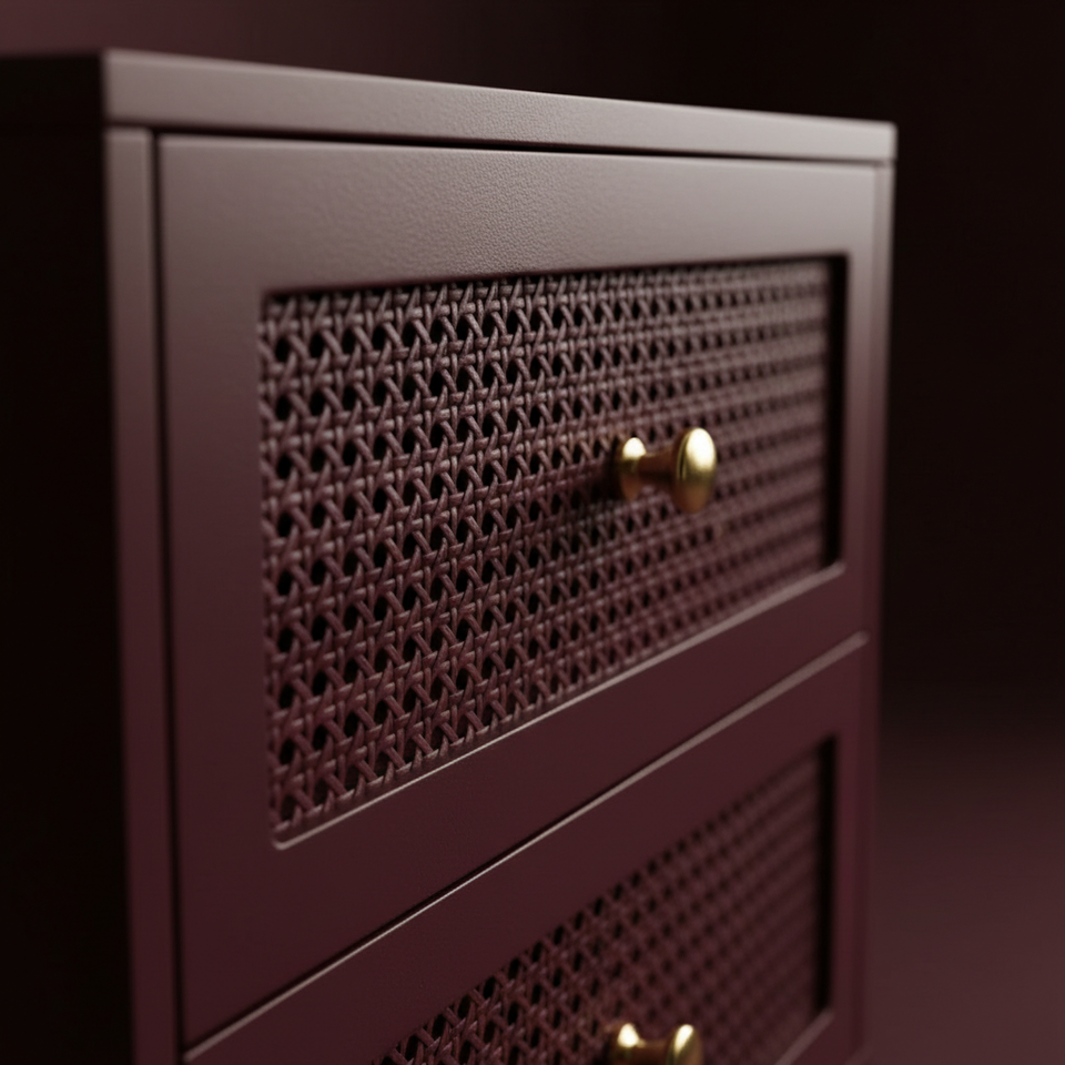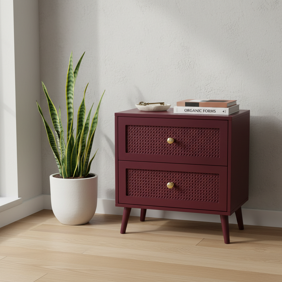 โต๊ะข้างโซฟา 2 ลิ้นชัก ดีไซน์ทันสมัย เป็นมิตรกับสิ่งแวดล้อม 5+ ช่องเก็บของ ทำจากไม้ยางพารา MDF ปิดผิวโอ๊ควีเนียร์ ตกแต่งด้วยหวาย เหมาะสำหรับห้องนั่งเล่น