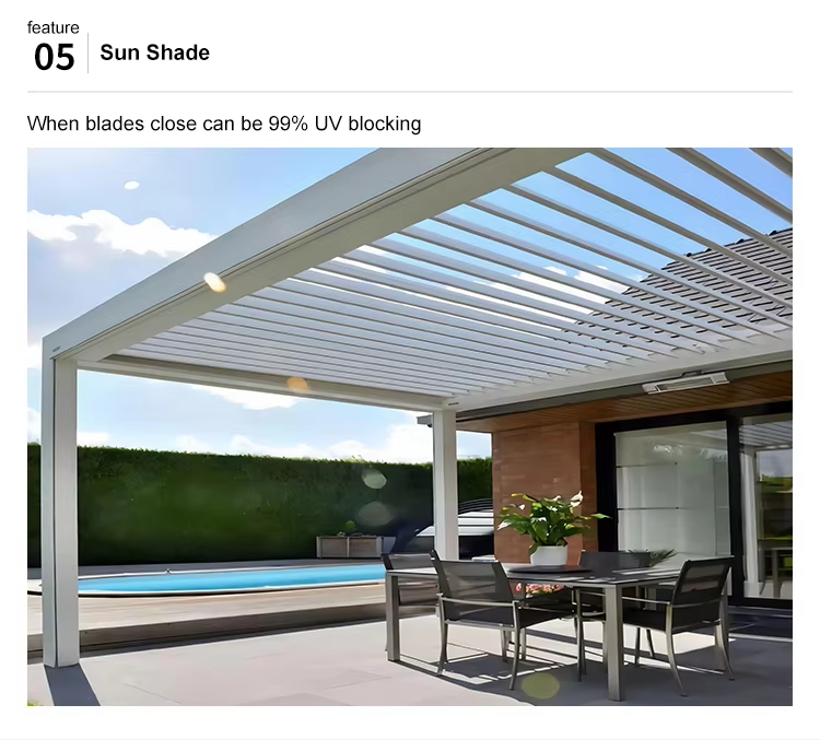 ศาลาอลูมิเนียมรักษ์โลกสมัยใหม่พร้อมหลังคาบานเกล็ดและม่านบังตาสำหรับพื้นที่นั่งเล่นกลางแจ้งบริเวณสระว่ายน้ำหลังบ้าน