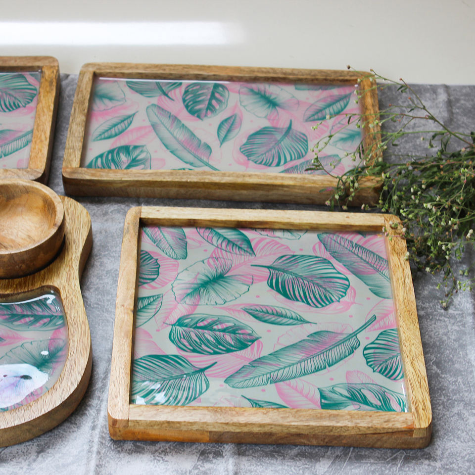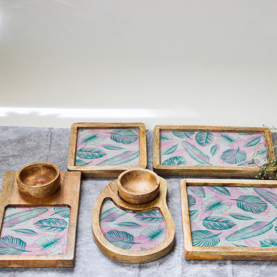 Modern Eco-Friendly Durable Handcrafted for Wood Serving Tray Set Enamel Printed Pattern Resin Inlay Ramadan Wedding Diwali