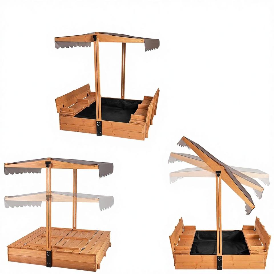กระบะทรายไม้สำหรับเด็ก พร้อมหลังคา กันสาด และม้านั่งพับได้
