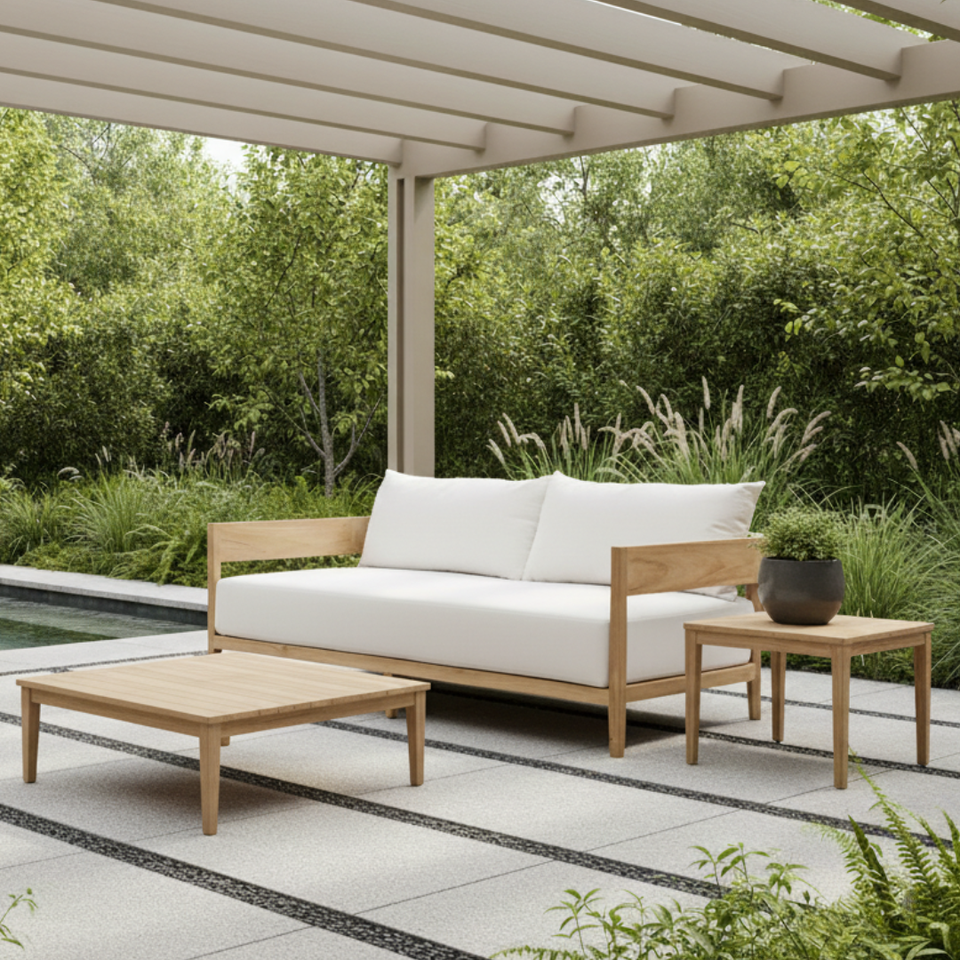 โซฟาไม้สักสำหรับสวนแบบรักษ์โลกทันสมัย 3 ที่นั่ง สำหรับโรงแรม บ้านพักตากอากาศ วิลล่า และอพาร์ตเมนต์ เฟอร์นิเจอร์กลางแจ้ง