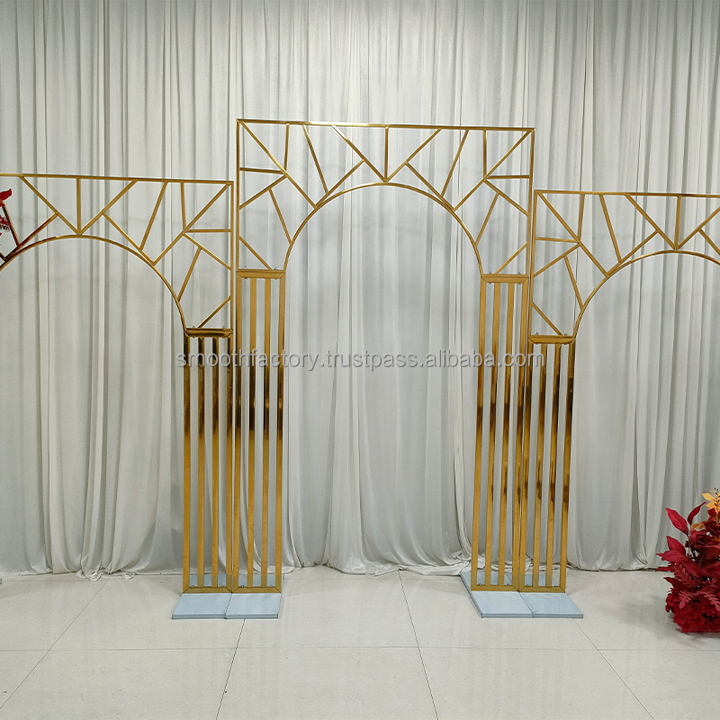 การตกแต่งเวทีงานแต่งงานสีทองสุดหรูแบบทันสมัยการตกแต่งของตกแต่งซุ้มประตูงานปาร์ตี้แบบเรียบพร้อมขาตั้งกรอบสแตนเลสแบบถอดได้