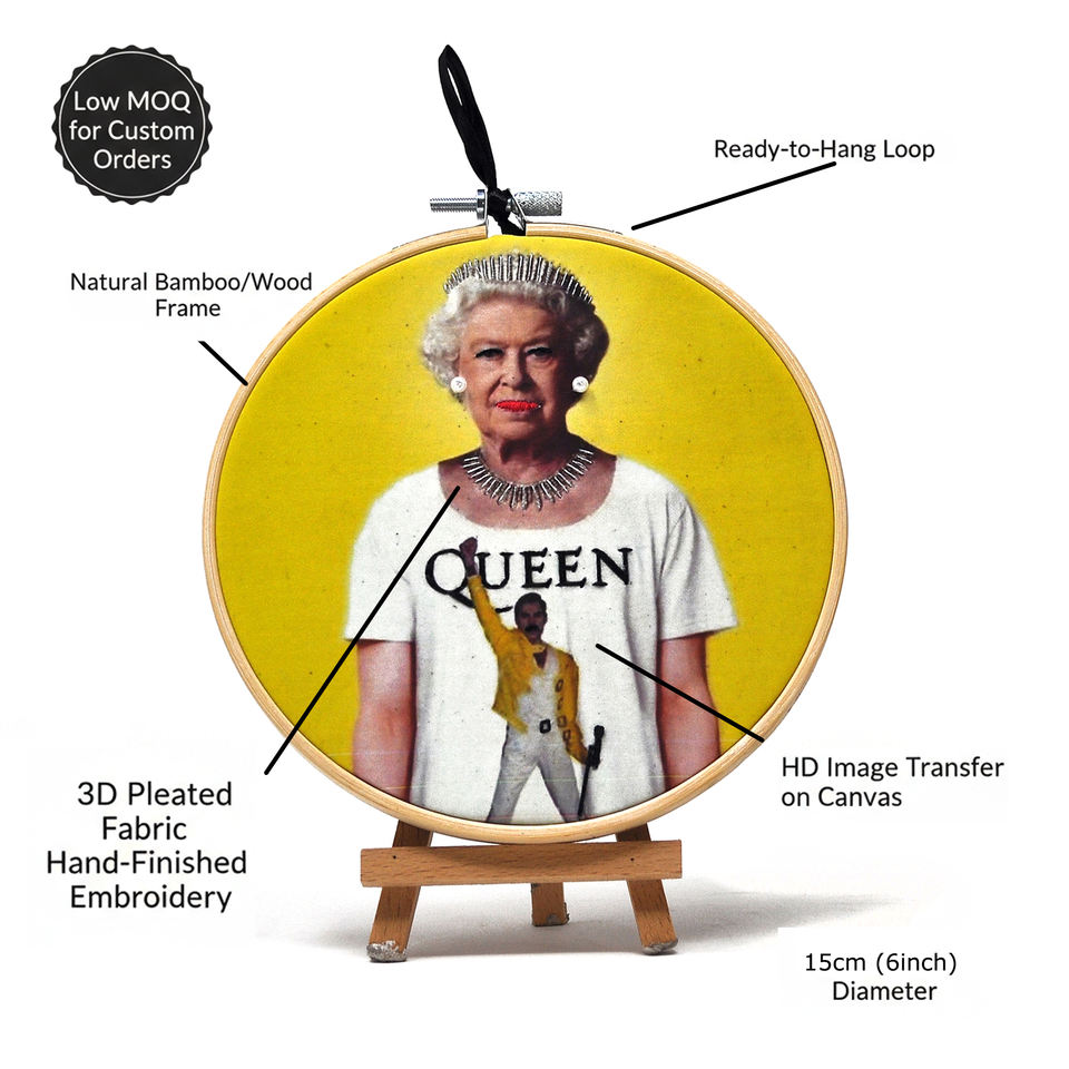 งานปักป๊อปอาร์ตแฮนด์เมดตกแต่งวงกลม | ภาพเหมือนราชินีแห่งสื่อผสมและรูปแบบร็อคไอคอน สำหรับร้านค้าบูติกและการออกแบบตกแต่งภายใน ขนาด 15 ซม.