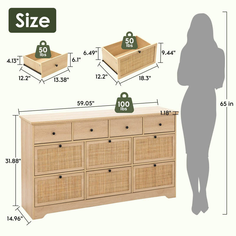 Modern European Boho Dresser with 10 Drawers Natural Rattan Iron Finish French Style Bedroom Furniture for Living Room Bedroom