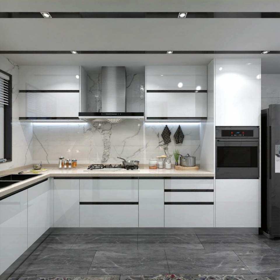 ตู้ครัวสไตล์ยุโรปสมัยใหม่แผงประตูกระจกเคลือบแล็กเกอร์ไม้อัดไม้เนื้อแข็งสแตนเลสอะคริลิค MDF สำหรับอ่างล้างหน้าในตู้เย็น